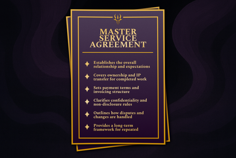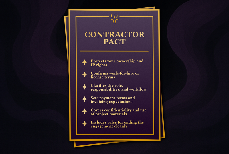 Agreements that bind collaborators, sponsors, studios, and partners to shared obligations. Pacts give structure to creative work by defining duties, rights, and consequences. These documents are designed for real creator and studio workflows, letting you collaborate with confidence and protect the value of your time and craft.